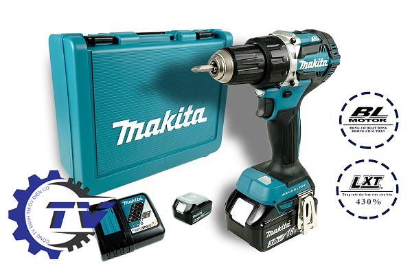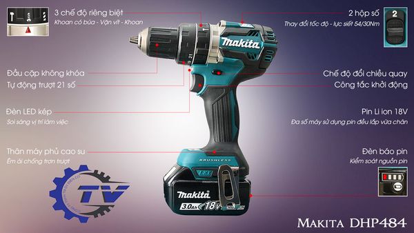 - Máy khoan búa chạy Makita DHP484RFE tích hợp 2 chức năng: Khoan và vặn vít với công suất cao, có thể hoạt động liên tục trong thời gian dài.