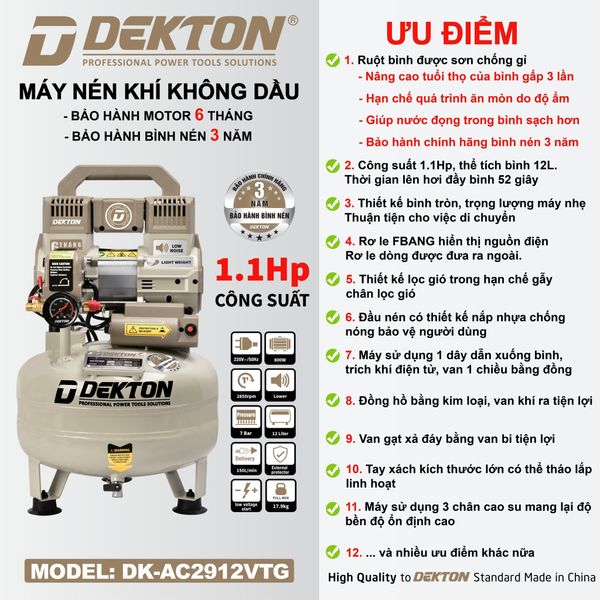 – Máy Nén Khí Không Dầu Dekton DK-AC2912VTG là dòng sản phẩm Dekton thương hiệu có nguồn gốc từ Đức. Nổi tiếng với các thiết bị như: