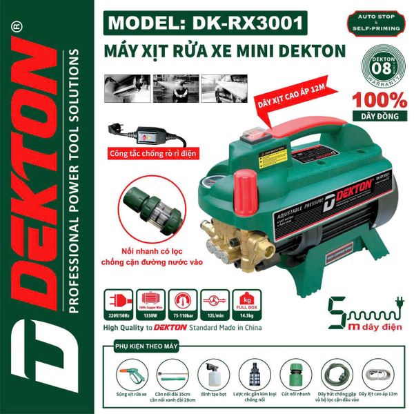 Máy rửa xe chỉnh áp 1350W DEKTON DK-RX3001 hay còn gọi là máy rửa xe, máy xịt cao áp, máy bơm rửa xe dùng để rửa xe hơi, xe gắn máy, vệ sinh máy lạnh, vệ sinh đường ống ... hay rửa xe gia đình
