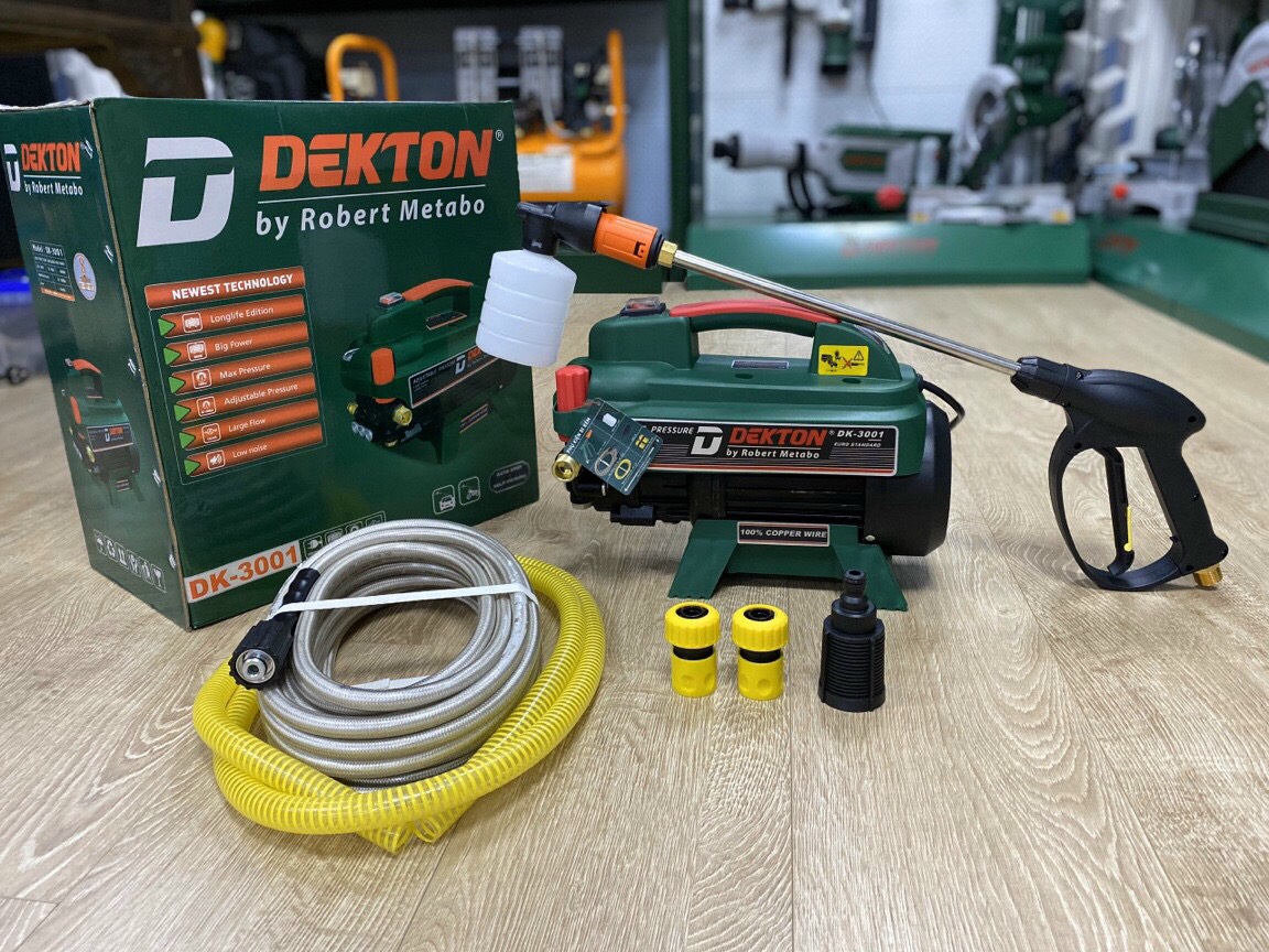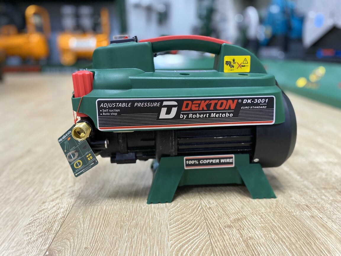 Máy xịt rửa cao áp Dekton DK 3001 - 3000 W (chỉnh áp) hay còn gọi là máy rửa xe, máy xịt cao áp, máy bơm rửa xe dùng để rửa xe hơi, xe gắn máy, vệ sinh máy lạnh, vệ sinh đường ống ... hay rửa xe gia đình