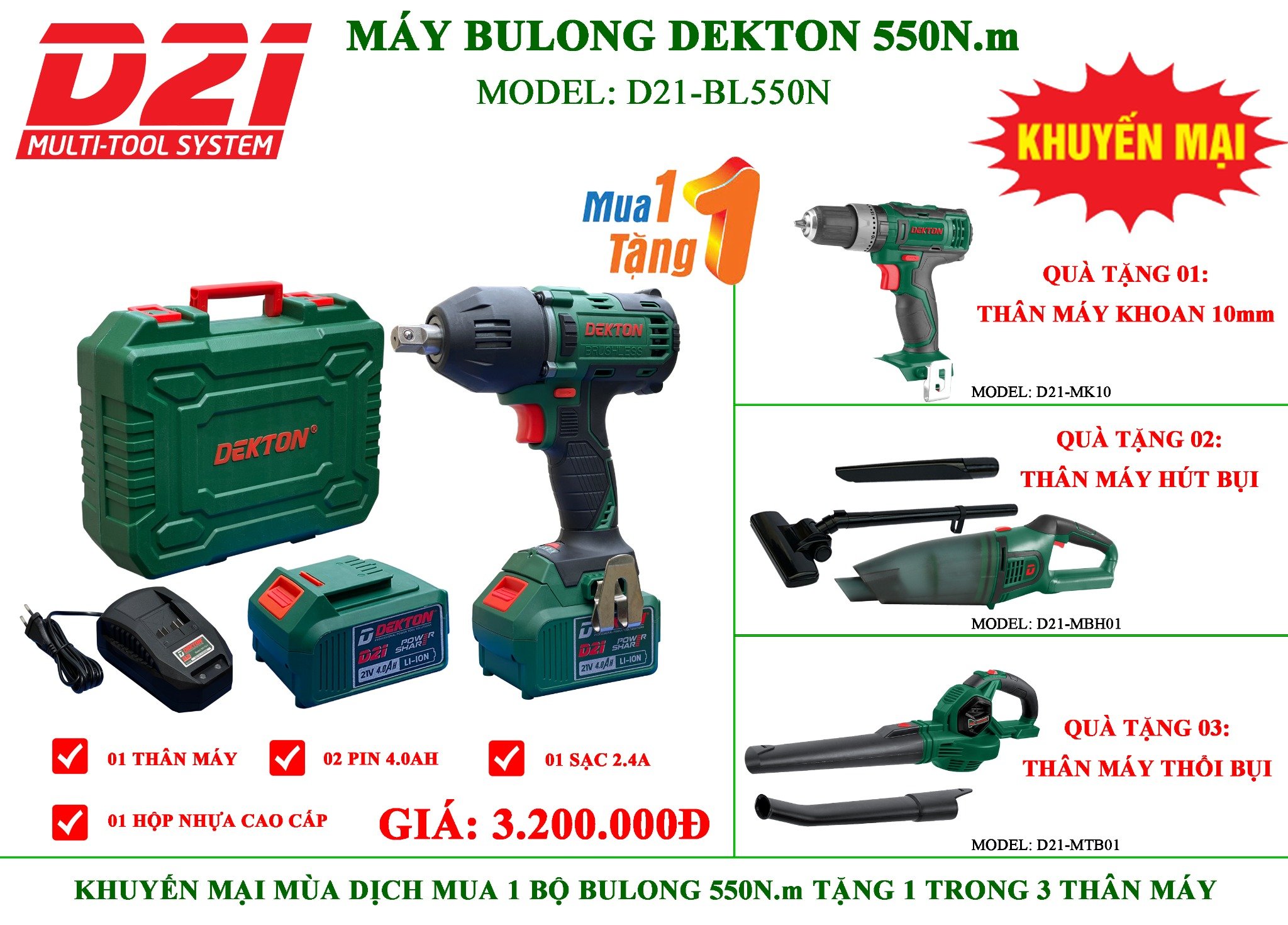 Máy Siết Bulong Pin Dekton D21-BL550N (Mua 1 tặng 1)