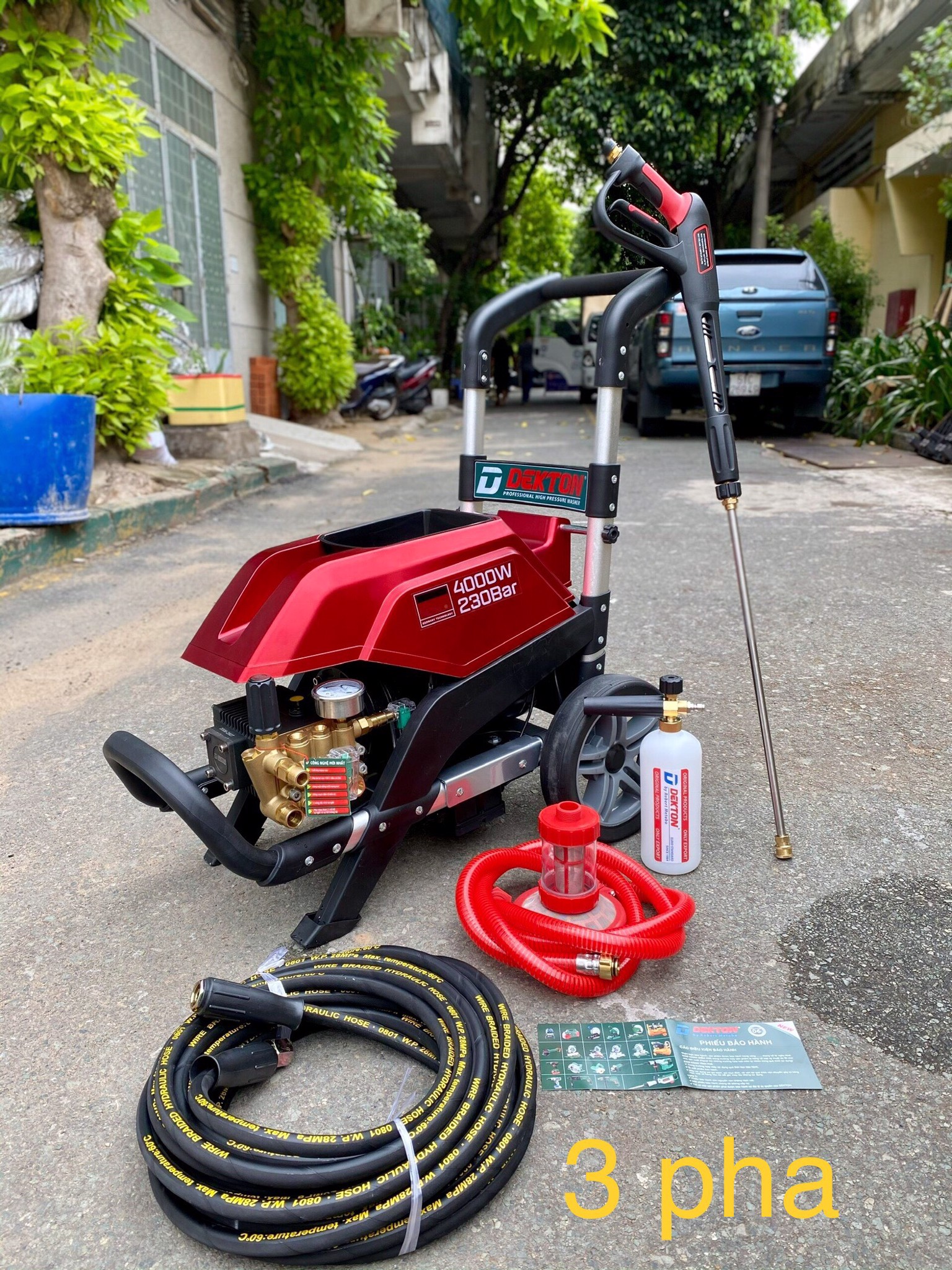 - Máy rửa xe chuyên nghiệp Dekton DK-HPW4000 có áp lực phun từ 50 - 230 bar với lưu lượng nước lên đến 16 L/ phút